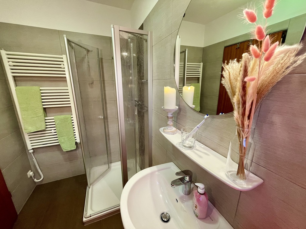 für viel Tageslicht, eine praktische Handtuchheizung sowie eine Waschmaschine – ideal für längere Aufenthalte oder Ausflüge an den Strand.