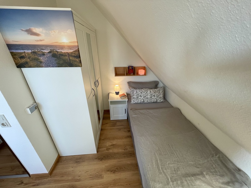 Das erste Schlafzimmer verfügt über ein bequemes Doppelbett und lädt nach einem erlebnisreichen Tag an der Nordsee zum Entspannen ein. Direkt daneben befindet sich ein zweites Schlafzimmer mit zwei
